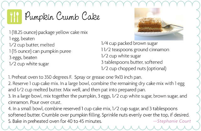 Made the pumpkin crumb cake last night and it was fast, easy and delicious. Ate it for breakfast today...shame on me.